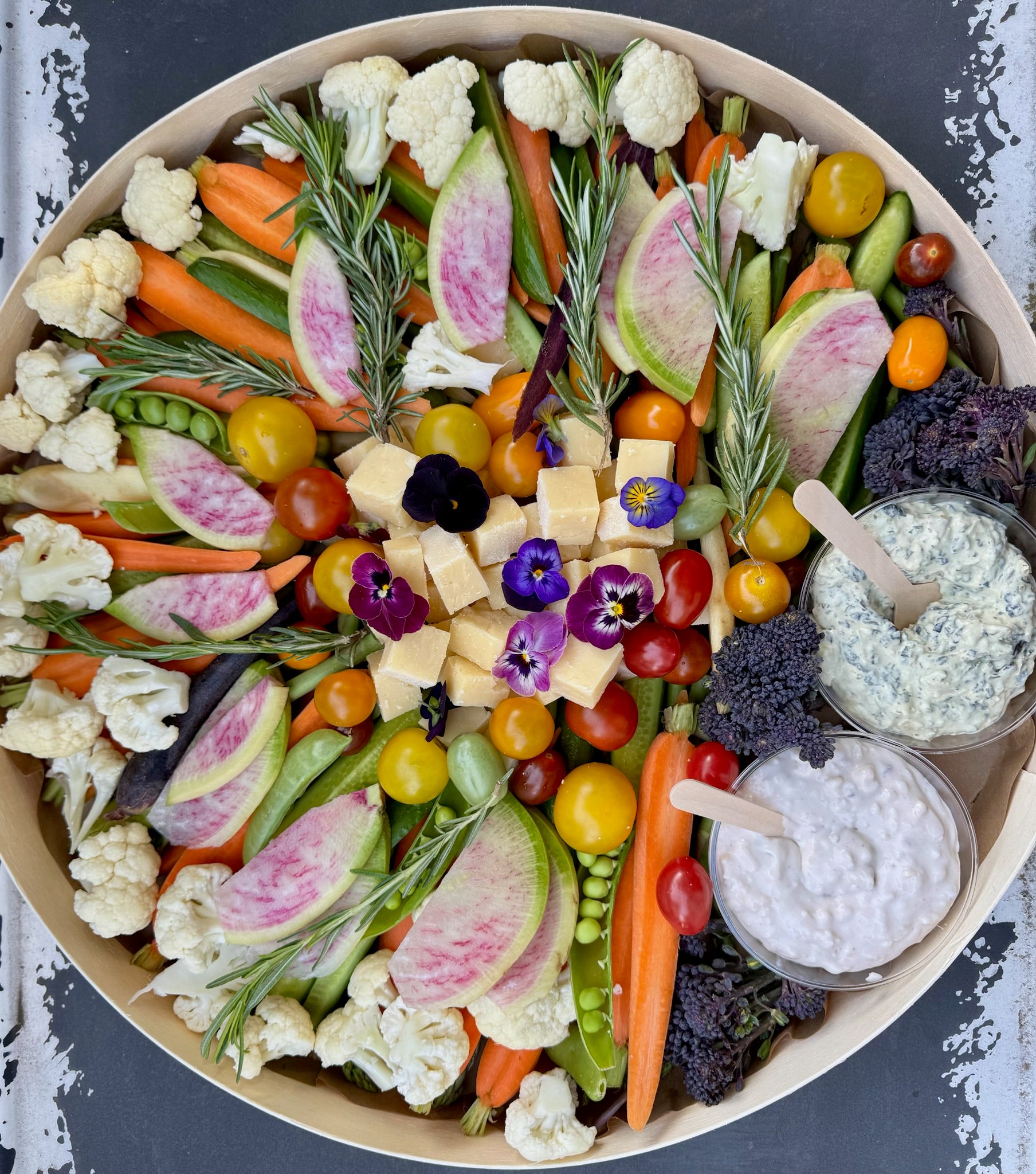 This Crudités Graze offers a delicious and healthy assortment of seasonal vegetables, 1 cheese, and 2 dips. 4oz crackers will be included on the side.